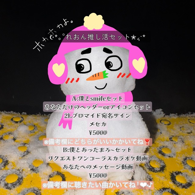 A:僕とsmileセット ¥5000(税抜) あなただけのヘッダーorアイコンセット ※備考欄にどちらがいいかかいてね 2Lブロマイド宛名サイン メセカ B:僕とあったまろ~セット ¥5000(税抜) リクエストワンコーラスカラオケ動画 ※備考欄に聴きたい曲かいてね あなたへのメッセージ動画