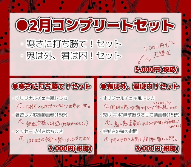 A.寒さに打ち勝て!セット ¥3000(税抜) ・暑苦しい応援動画券(15s) ・オリジナルチェキ風トレカ ・手書きメッセージ付きはちまき B.鬼は外、君は内!セット ¥3000(税抜) ・鬼(ナキ)に無茶振りさせて動画券(15s) ・オリジナルチェキ風トレカ ・手描きの鬼のお面 (A.B各¥3000 15個ずつ) C.2月コンプリートセット ¥5000(税抜) ・寒さに打ち勝て!セット ・鬼は外、君は内!セット