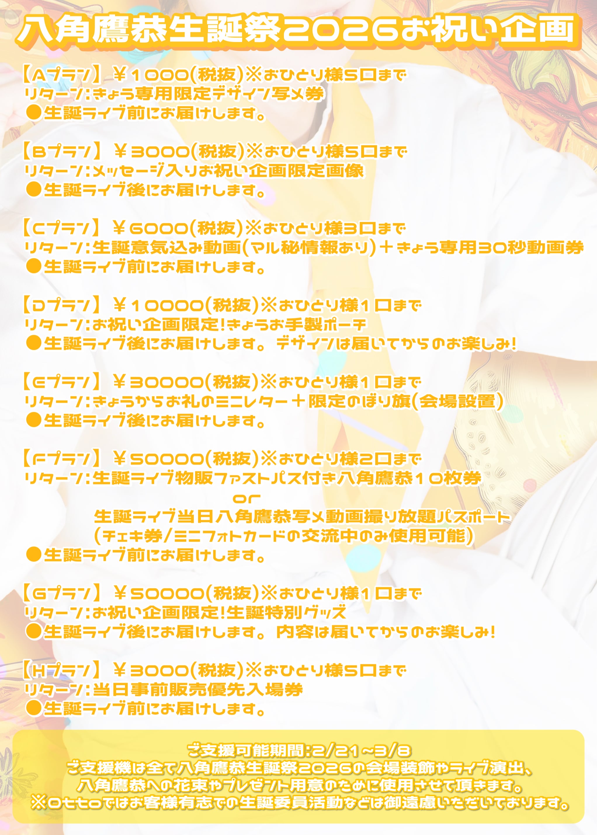 ・リターン商品の発送は生誕ライブ当日以降のお渡し、発送となります。